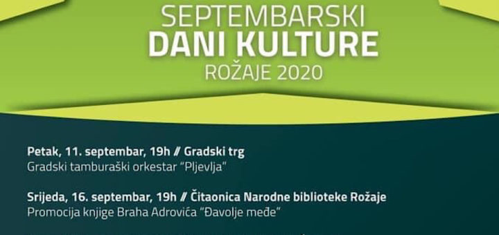 Petak, 11. septembar, 19h // Gradski trgGradski tamburaški orkestar “Pljevlja” Srijeda, 16. septembar, 19h // Čitaonica Narodne biblioteke RožajePromocija knjige Braha Adrovića “Đavolje međe” Ponedeljak,...